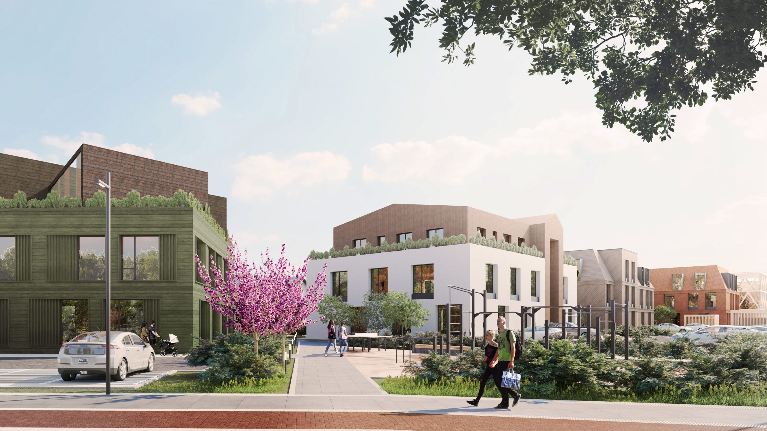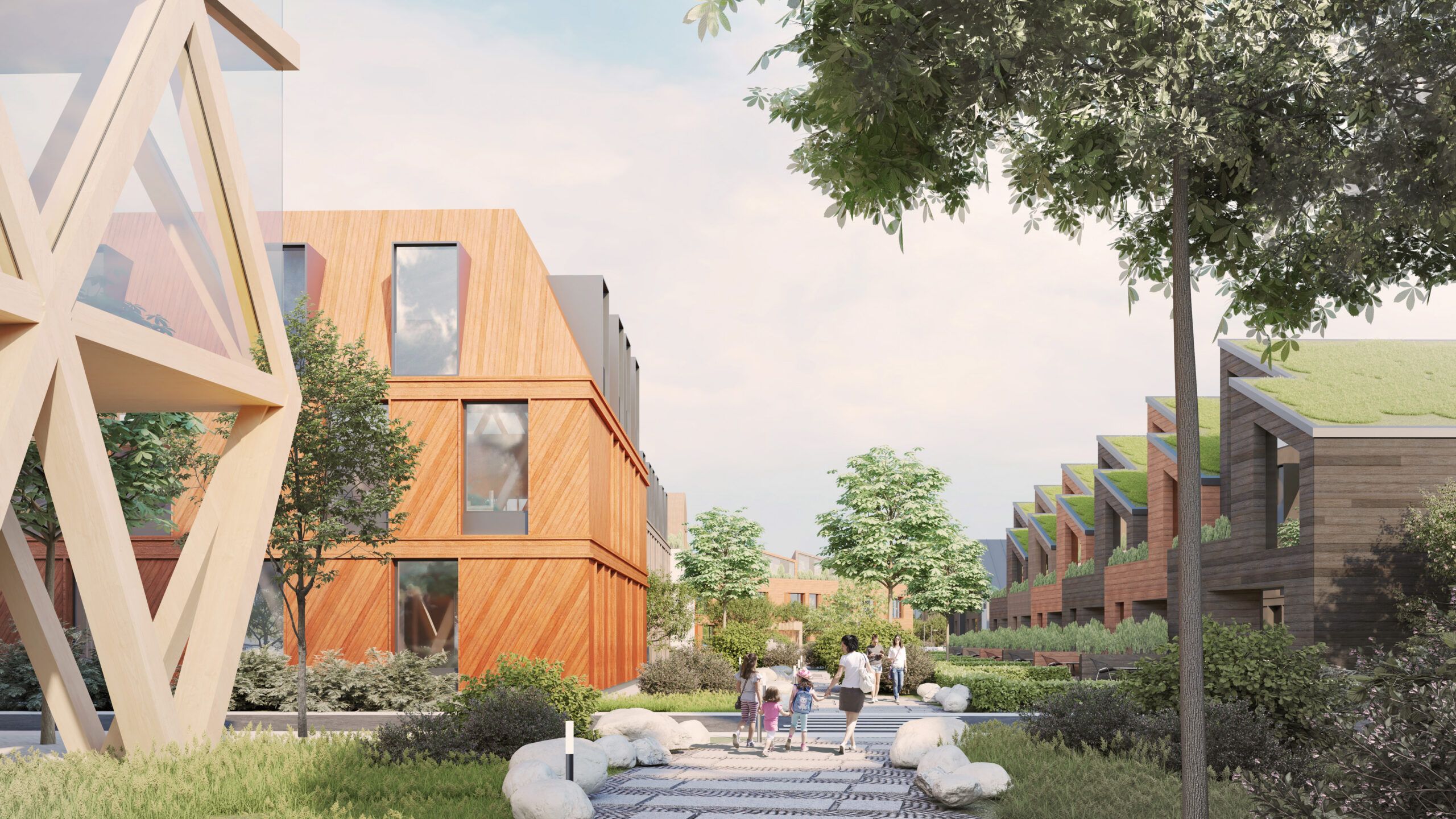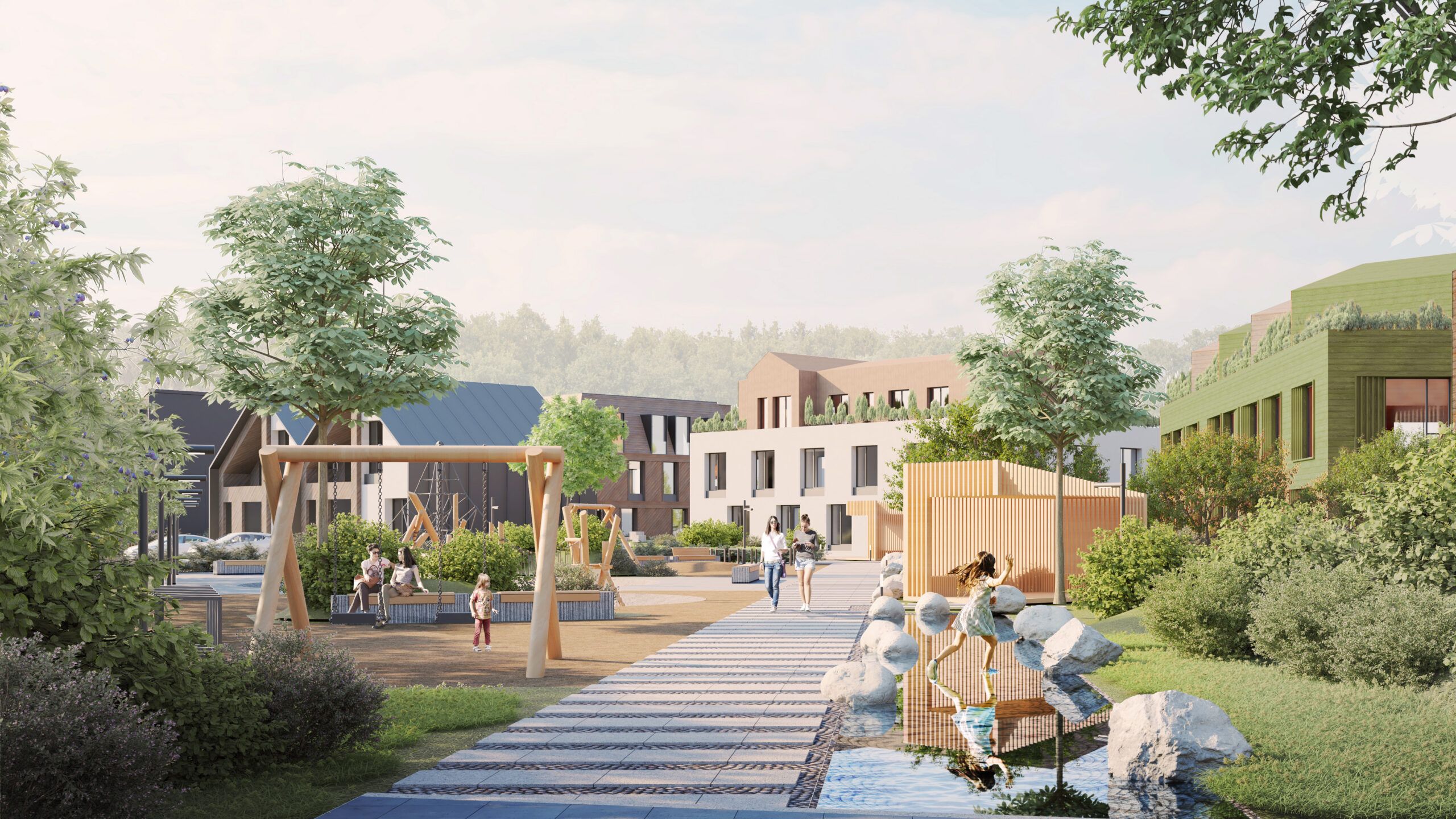 Landscape architecture solutions play a key role in the project, focusing on sustainable watermanagement and local biodiversity.Rainwater is thoughtfully integrated into the landscape throughpermeable surfaces, rain gardens, bioswales, and vegetated roofs, turning stormwater into an attractivevisual feature. The selection of native trees and plants, such as lindens, maples, oaks,cherries, andbirches, creates a rich habitat supporting local flora and fauna while providing residents with year-roundaesthetic and ecological value.